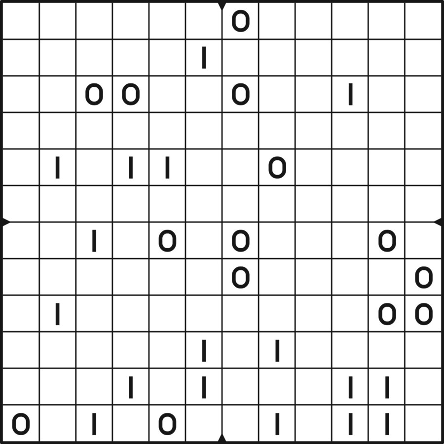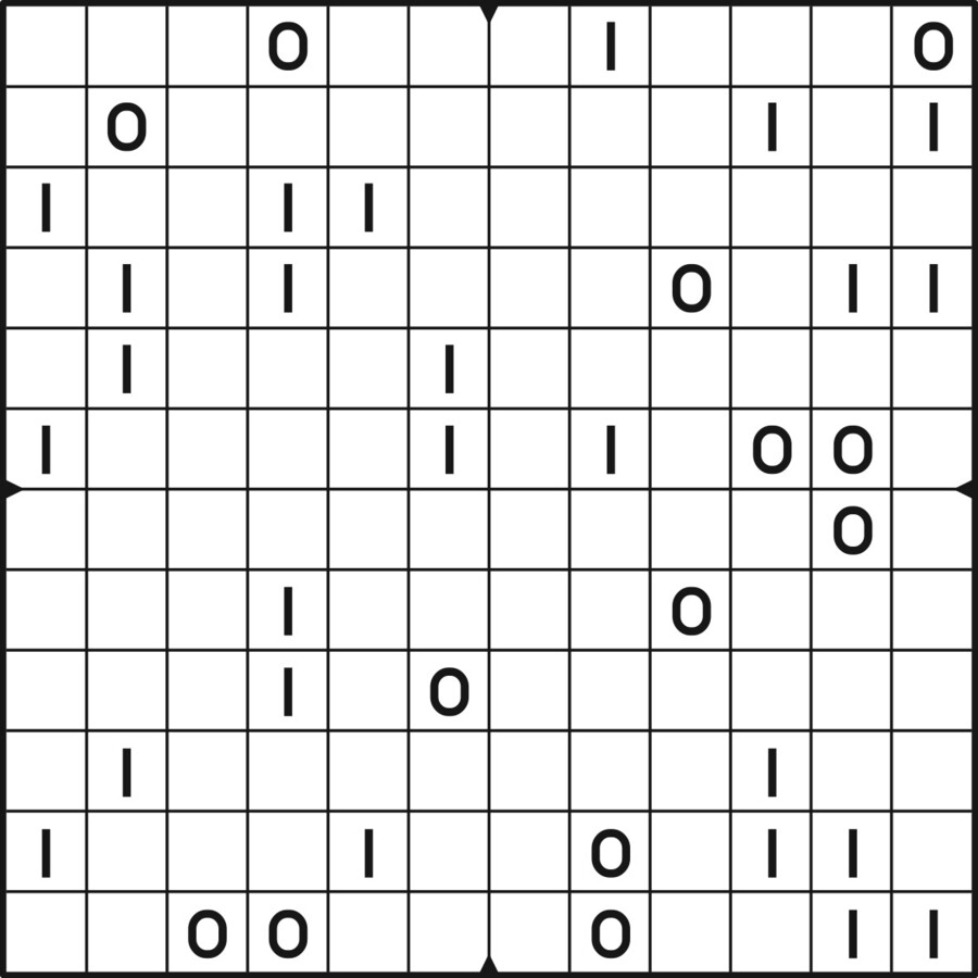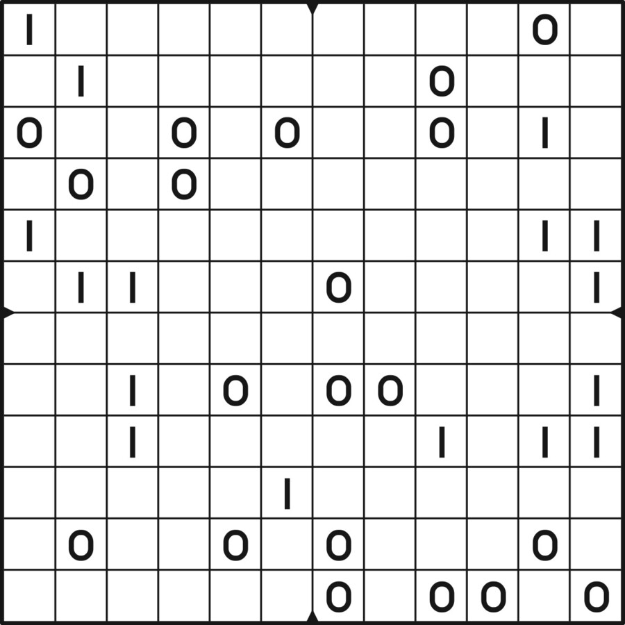 A daily binairo puzzle! Solve each puzzle with only 0's and 1's. Remember: No more than two the same numbers may be placed directly next to or below each other. Every row and every column must contain as many zeroes as ones. The combination of zeroes and ones in every row must be unique, as does the combination in each column.