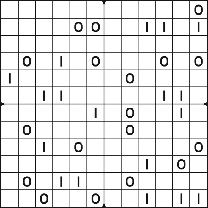 Every Sunday solve a special edition binairo. Remember: Solve each puzzle with only 0's and 1's and no more than two the same numbers may be placed directly next to or below each other. Every row and every column must contain as many zeroes as ones. The combination of zeroes and ones in every row must be unique, as does the combination in each column.
